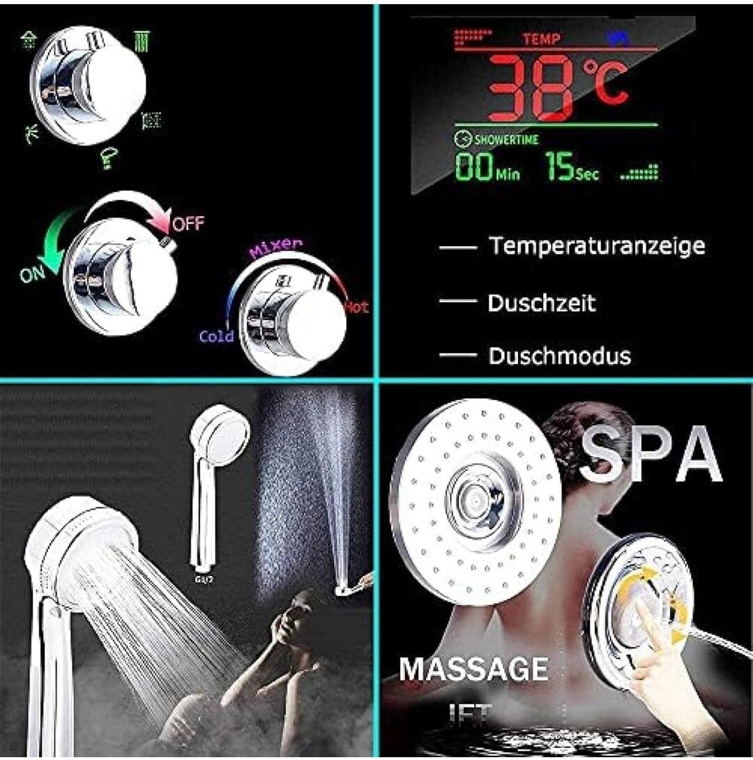 Dieses Duschsystem besteht aus Edelstahl 304, Messinganschlüssen und einem Handbrausekopf aus Kunststoff. Es ist hochtemperaturbeständig, rostfrei und auslaufsicher. Mit gebürsteter Verarbeitung ist es cool, luxuriös und elegant. Auch mit einem LED-Bildschirm zur Anzeige der Wassertemperatur und Duschzeit in Echtzeit.