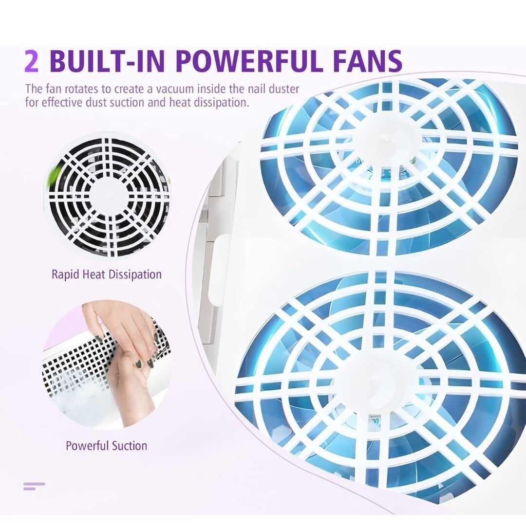 Der Nagelstaubsauger verfügt über zwei eingebaute leistungsstarke Lüfter, die den gesamten Nagelstaub aus allen Richtungen effektiv absaugen und so eine gesunde Nagelumgebung für Sie schaffen können. Es eignet sich sehr gut zum Entfernen von Nagelkunst und abgestorbener Nagelhaut.