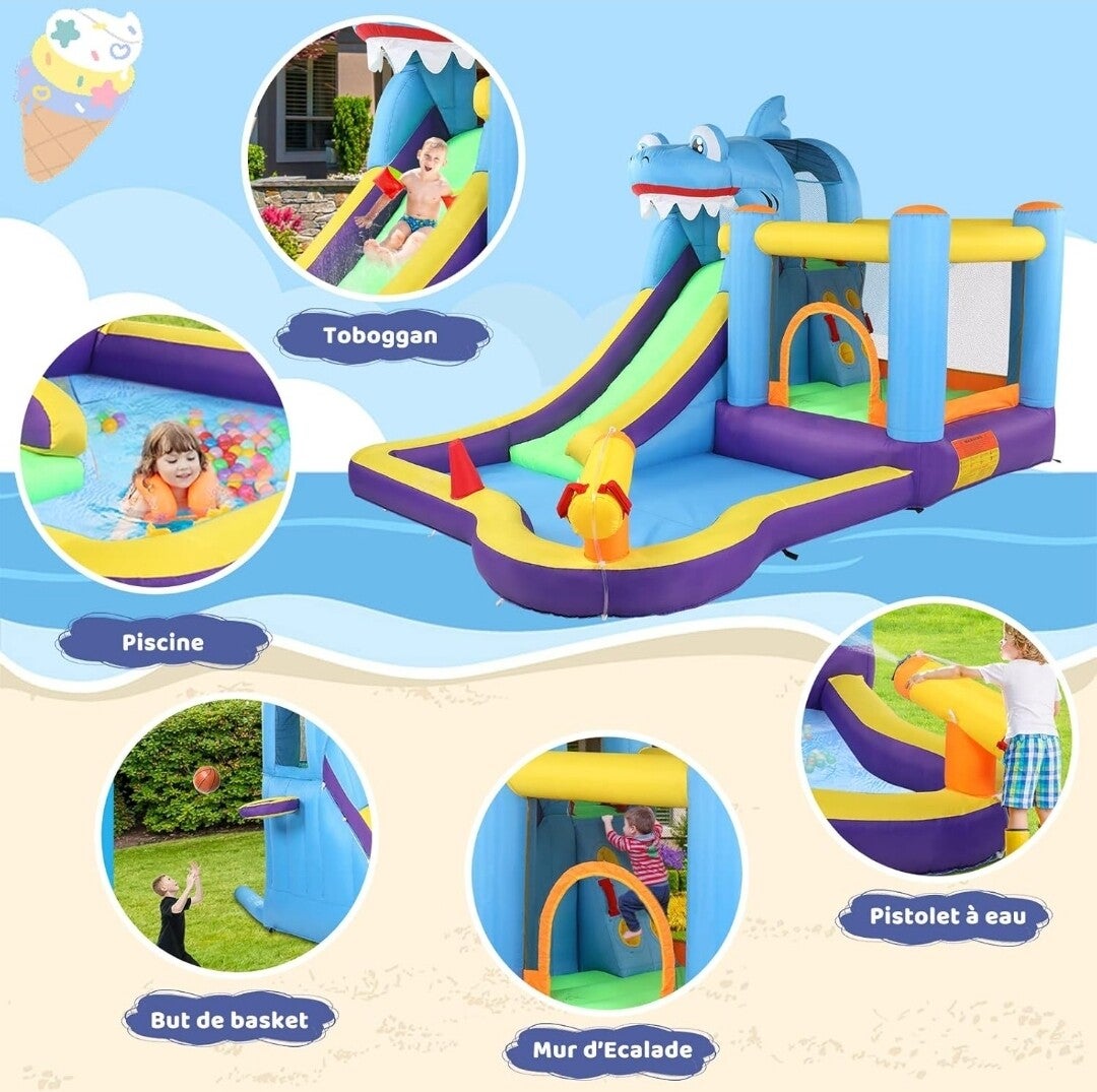 LEADZM Hüpfburg mit Gebläse, Aufblasbare Wasserpark mit Hai-Thema, mit Trampolin, Rutsche, Schwimmbecken, Wasserpistole, Geeignet für 3 Kinder im Alter von 3 bis 10 Jahren, 380x260x240 cm Amazons Tipp
